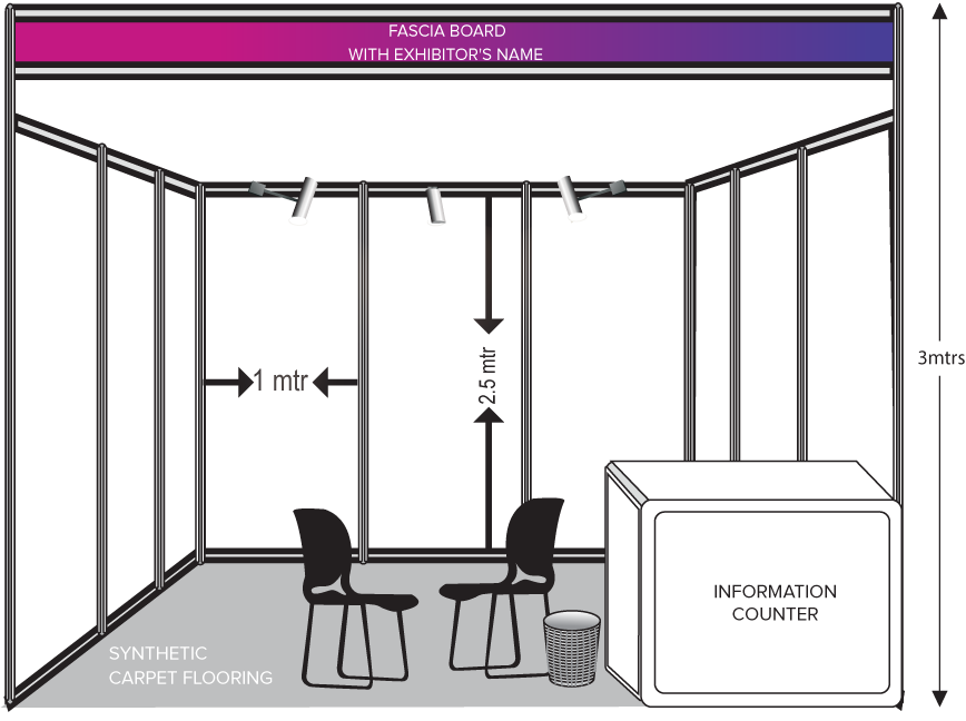 Each 9 sqm will include 2.5m ht shell scheme with side and back wall panels, fascia, carpet, 1 information counter, 3 spotlights, 2 chairs, 220 v Socket and 1 waste paper bin.