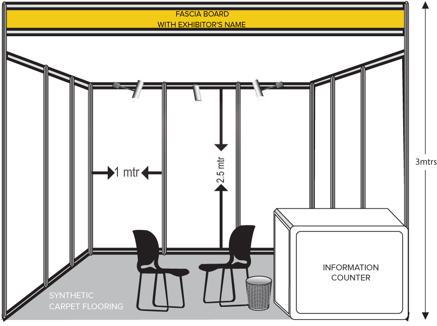 Each 9 sqm will include 2.5m ht shell scheme with side and back wall panels, fascia, carpet, 1 information counter, 3 spotlights, 2 chairs, 220 v Socket and 1 waste paper bin.